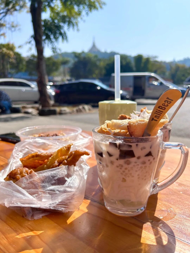 ●缅甸甩粑粑:与缅甸仅一寨之隔的地舆上风,让这里的缅甸好意思食正统无比。薄如蝉翼的饼皮,淋上香甜的真金不怕火乳,再撒上芝麻和椰蓉,一口下去,酥脆中带着奶香,是甜食控的必点项。雇主现作念现卖,还能看到甩饼的绝活。