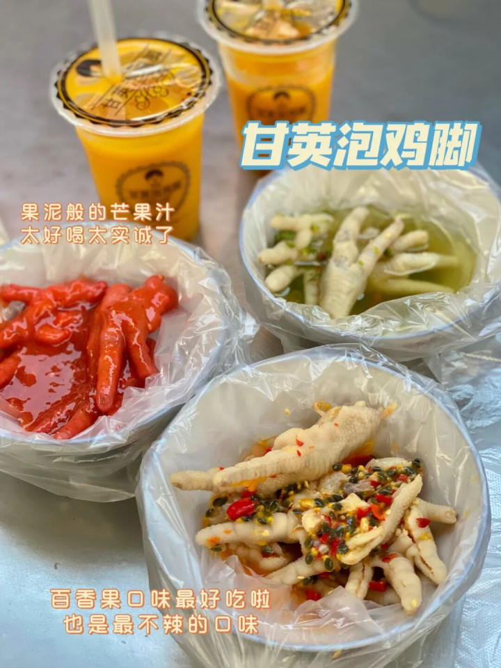 ●泡鸡脚 & 泡鲁达:酸辣入味的泡鸡脚是解馋神器,鸡脚脆嫩,泡汁开胃;而满满一大杯的泡鲁达(椰丝、西米、面包干、椰子片……),则是炎闷热日里最清爽的慰藉。喝一口,椰香四溢,甜而不腻。