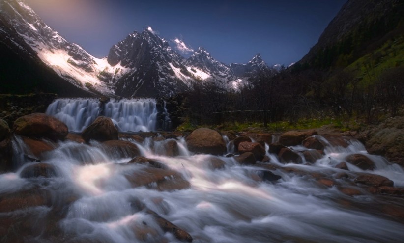 淌若说达古冰川是震憾大片,那毕棚沟即是冬日适度的童话插画。云杉和冷杉裹着雾凇,像披银甲的丛林卫士,静静守着河谷。阳光穿过林隙,雪粒骤然化作飘浮的钻石粉尘,顺手一拍皆是电影感。短短3公里栈谈,竟塞进了冰川、温泉、红石滩三种地貌——脚边是冒着热气的温泉,昂首是白净雪峰,地舆教材里的“垂直当然带”在这里被压缩成一步一景的视觉魔术。晚上住进沟口藏寨,窗外是墨蓝夜色中的雪山剪影,屋内柴火噼啪,酥油茶咕嘟冒香,间隔值告成拉满。