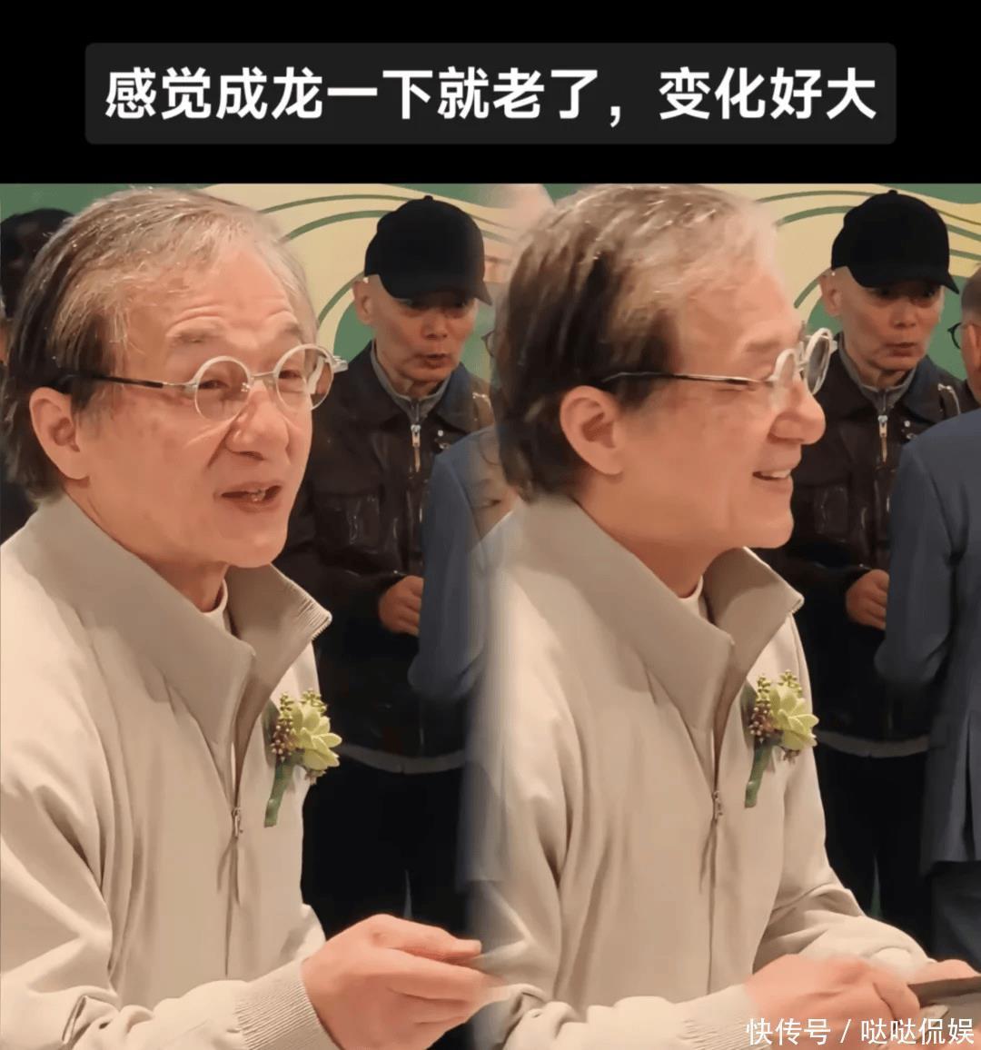 步履现场的粉丝拍到的相片里,成龙衣着米白色通顺装,头发白得像是打了高光。