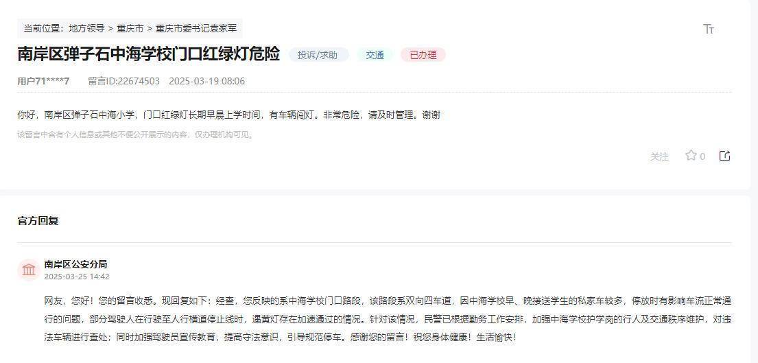 对此,南岸区公本分局进行了核实。在回复中暗示,该路段系双向四车说念,因中海学校早、晚接送学生的私家车较多,停放时有影响车流泛泛通行的问题,部分驾驶东说念主在行驶至东说念主行横说念住手线时,遇黄灯存在加快通过的情况。