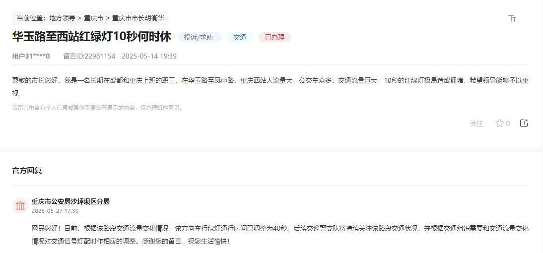 重庆市公安局沙坪坝差异局获悉留言后,立时进行了现场拜访。在回复中,沙坪坝差异局暗示,现在,凭证该路段交通流量变化情况,该标的车行绿灯通行期间已调遣为40秒。后续交差人支队将抓续心境该路段交通情景,并凭证交通组织需要和交通流量变化情况,对交通讯号灯配时作相应的调遣。