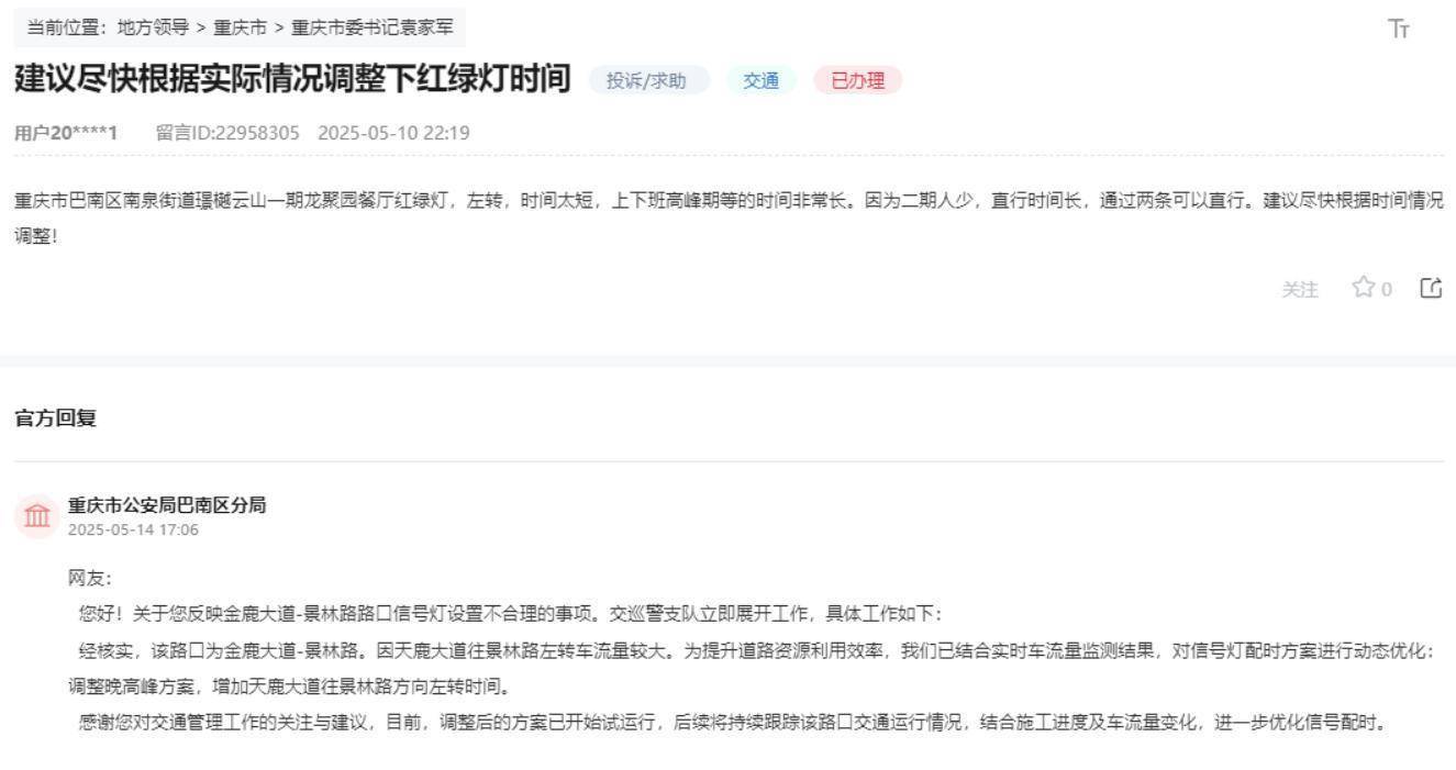 东说念主民网重庆6月2日电 (陈琦)交通讯号灯是爱戴城市交通秩序的遑急时期,关系到市民出行的便捷和安全。近日,不少网友在东说念主民网“指导留言板”反应红绿灯配时辰歧理等问题,取得重庆关系部门实时恢复,鞭策问题取得惩处。