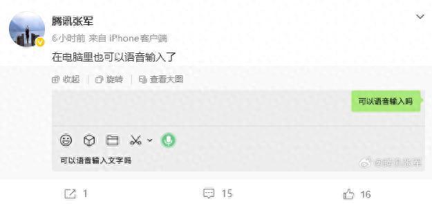 2月13日音信欧洲杯体育,腾讯公司公关总监张军本日在官微发布音信,晓谕微信已提拔电脑端语音输入功能。