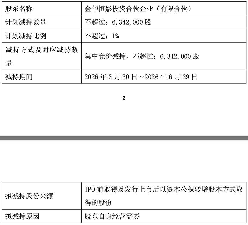 公告知道,金华恒影凭证本人研讨需要,权术自本公告线路之日起15个交游日后的3个月内,通过上海证券交游所交游系统以伙同竞价大致巨额交游方式,减捏不朝上6,342,000股公司股份,即不朝上公司总股本的1%。